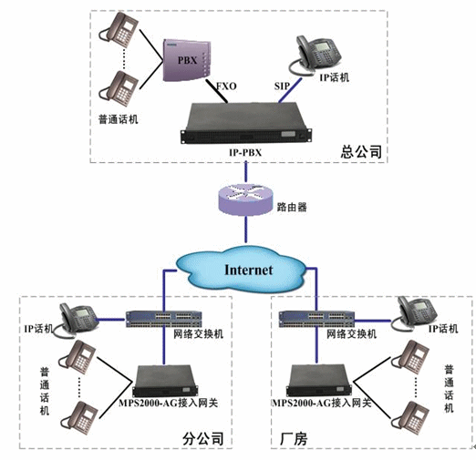 各分公司根據(jù)實際分機數(shù)配置相應的接入網(wǎng)關或IP話機。接入網(wǎng)關和IP話機通過Internet注冊到位于總公司的IP-PBX上,實現(xiàn)了總部電話和分公司、廠房電話之間的通信、號碼直撥、來電顯示等功能。