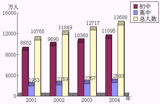 據(jù)國家最新統(tǒng)計資料分析,2001年中學(xué)學(xué)生人數(shù)已達(dá)10765萬人,而且學(xué)生人數(shù)還在快速增長。初中學(xué)生人數(shù)以每年6.5%的速度增長,普通高中學(xué)生人數(shù)也以每年10%-11%的速度增長。
