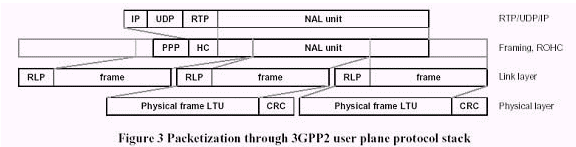 因為包交換服務(wù),3GPP/3GPP2同意了一個基于IP的協(xié)議棧。圖3展示了一個NAL單元通過3GPP2用戶平面協(xié)議堆棧被封裝在RTP/UDP/IP的典型過程。在頭壓縮(RoHC)后,此IP/UDP/RTP包被封裝進(jìn)一個PDCP/PPP2包,變成了頻率鏈路控制(RLC)和服務(wù)數(shù)據(jù)單元(SDU)。RLC協(xié)議可以在三種模式下工作:透明、非確認(rèn)和確認(rèn)模式。RLC協(xié)議為用戶和數(shù)據(jù)提供分段和重傳服務(wù)。在透明和非確認(rèn)模式,RLC被定義為單向的;在確認(rèn)模式,RLC被定義為雙向的。對於所有的RLC模式,循環(huán)冗余檢查(CRC)的錯誤檢測在物理層上被運行,而且CRC檢查的結(jié)果和真實的數(shù)據(jù)一起被遞送到 RLC。在透明模式中,沒有上層的協(xié)議被增加到較高層的數(shù)據(jù)中。錯誤的協(xié)議數(shù)據(jù)單元(PDUs)可以被丟棄或標(biāo)記為錯誤。在非確認(rèn)模式中,沒有重傳協(xié)議在使用中,而且數(shù)據(jù)傳送沒有保證。接受到的錯誤數(shù)據(jù)根據(jù)配置來決定丟棄或標(biāo)記為錯誤。在確認(rèn)模式中,一種自動的重復(fù)請求機制被用于錯誤訂正。