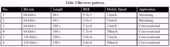 在H.264/AVC的標(biāo)準(zhǔn)化進(jìn)程中,移動視頻傳輸?shù)闹匾砸呀?jīng)在3G移動傳輸里面通過對基于H.324M的電路交換會話服務(wù)、包交換會話和流服務(wù)得到了證實。這些測試情況允許適當(dāng)?shù)木幋a特征、測試和容錯仿真等特征的選擇,同時也可以得到有意義的測試結(jié)果。在本文,我們將會把重心集中在基于IP的測試情況。在正常的測試情況下,我們會定義6個測試情形組合,主要測試通過3G移動網(wǎng)絡(luò)的包交換會話服務(wù)和包交換流媒體服務(wù)。另外,測試環(huán)境包括簡單的脫機3GPP/3GPP2仿真軟件、程序接口和評估標(biāo)準(zhǔn)。無線信道使用專門生產(chǎn)用于移動無線信道仿真的位率差錯模板來進(jìn)行仿真。 位率差錯模板在物理層上和RLC/RLP層下來捕獲,因此,它們在實驗被用于物理層仿真。通過位率差錯模板實驗中得出的碼率、長度、位錯誤率和移動速度數(shù)據(jù)詳見下表2。