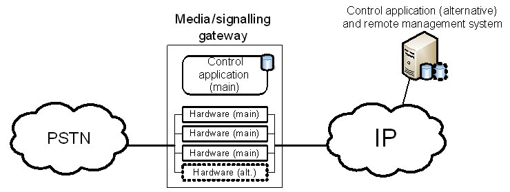 這兩種保護(hù)機制的區(qū)別可以從下面的例子進(jìn)一步闡述。該事例是一種企業(yè)IP-PSTN網(wǎng)關(guān)應(yīng)用。一般情況下,企業(yè)級的網(wǎng)關(guān)并不采用軟交換架構(gòu),所以媒體和信令網(wǎng)關(guān)功能在同一設(shè)備內(nèi)實現(xiàn)。這類網(wǎng)關(guān)是一個獨立的機架,內(nèi)裝能實現(xiàn)媒體和信令處理的硬件板卡和控制類應(yīng)用程序。此設(shè)備可以本地管理,也可以采用遠(yuǎn)程管理,如采用標(biāo)準(zhǔn)Web服務(wù)器。