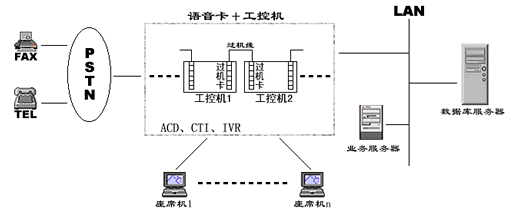 在一些小型CALL CENTER系統(tǒng)中,人們通常通過語(yǔ)音板卡加工控機(jī)的方式搭建系統(tǒng),通常一臺(tái)設(shè)備就集成了ACD、IVR、CTI等各種資源,各資源的使用、調(diào)派通過軟件進(jìn)行控制,有效的解決了建設(shè)成本高、系統(tǒng)構(gòu)造繁復(fù)的問題,具有相當(dāng)?shù)撵`活性。然而由于工控機(jī)和語(yǔ)音板卡容量有限,同時(shí)其標(biāo)準(zhǔn)最多只能是工業(yè)級(jí)標(biāo)準(zhǔn),因此在構(gòu)建相對(duì)大型的呼叫中心時(shí)就總是捉襟見肘。為了增加系統(tǒng)容量,解決多臺(tái)PC之間進(jìn)行通道交換的難題,人們又設(shè)計(jì)了過機(jī)卡和過機(jī)線來解決,其應(yīng)用系統(tǒng)如下圖: