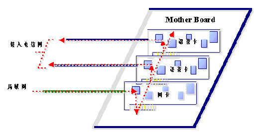 通過局域網(wǎng)傳遞語音數(shù)據(jù)本來就不能保證其時(shí)實(shí)時(shí)性,其結(jié)果就是用戶聽到的語音經(jīng)常斷續(xù),保證不了語音質(zhì)量。如果傳遞的語音數(shù)據(jù)是經(jīng)過壓縮的,語音數(shù)據(jù)本來就是通過TTS進(jìn)行合成的,再經(jīng)過壓縮,則音質(zhì)會(huì)有很大的損傷,因此同樣保證不了語音質(zhì)量。從上圖中我們可以看到,經(jīng)TTS合成的語音數(shù)據(jù)從局域網(wǎng)經(jīng)過網(wǎng)卡,再通過主板PCI(或ISA)總線進(jìn)入語音卡,最后進(jìn)入電信網(wǎng),同樣語音數(shù)據(jù)通過計(jì)算機(jī)主板經(jīng)PCI(或ISA)總線進(jìn)入語音卡也要求是實(shí)時(shí)的。這兩種實(shí)時(shí)性的要求會(huì)導(dǎo)致在接入量比較大的情況下,會(huì)給計(jì)算機(jī)的總線造成很大的負(fù)擔(dān)。因?yàn)榭偩的帶寬(數(shù)據(jù)吞吐量)是有限的。況且其它的板卡和接口(如聲卡、顯示卡等)也要直接或間接地占用總線。因此在接入量比較大的情況下,計(jì)算機(jī)的總線帶寬會(huì)成為一個(gè)比較關(guān)鍵的瓶頸。即便提高語音板卡的接入能力。在有大量電話接入的情況下,由于語音數(shù)據(jù)實(shí)時(shí)性的要求,也不能保證語音質(zhì)量。