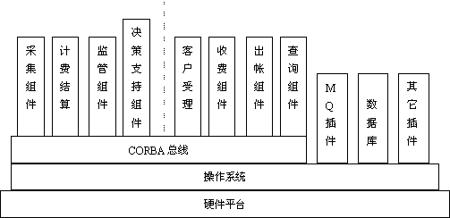 長(zhǎng)途電話聯(lián)機(jī)計(jì)費(fèi)系統(tǒng) 長(zhǎng)話計(jì)費(fèi)系統(tǒng)既包括計(jì)費(fèi)結(jié)算系統(tǒng),又包括營(yíng)業(yè)服務(wù)系統(tǒng),功能比較多,數(shù)據(jù)處理流程也相對(duì)復(fù)雜。 簡(jiǎn)單的傳統(tǒng)數(shù)據(jù)庫(kù)的機(jī)械化編程已很難滿足系統(tǒng)對(duì)大數(shù)據(jù)量的處理及靈活性等方面的要求,因此在這套系統(tǒng)中,我們采用了一些當(dāng)今業(yè)界的熱門技術(shù)。比如采用了CORBA軟總線思想和MQ Series消息管理隊(duì)列,也使之成為聯(lián)機(jī)計(jì)費(fèi)系統(tǒng)平臺(tái)的一次成功實(shí)施。其系統(tǒng)層次結(jié)構(gòu)圖如下: