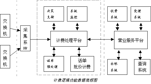 從邏輯功能上分,它經(jīng)常被分為三部分:采集系統(tǒng)、計(jì)費(fèi)處理系統(tǒng)、營(yíng)業(yè)服務(wù)系統(tǒng)。其具體數(shù)據(jù)流程如下圖所示: