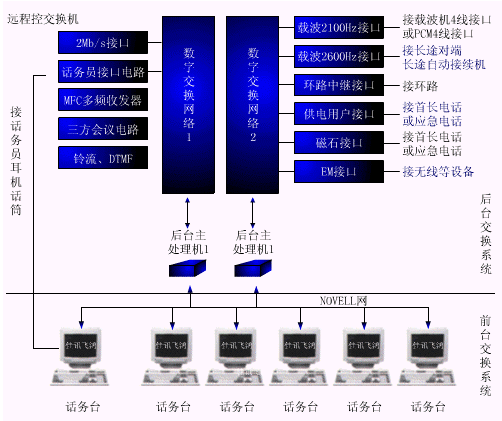 "前臺(tái)座席系統(tǒng)"包括班長(zhǎng)臺(tái)和話務(wù)臺(tái),均采用微機(jī),運(yùn)用先進(jìn)的計(jì)算機(jī)聯(lián)網(wǎng)技術(shù),將它們通過網(wǎng)絡(luò)與"后臺(tái)交換系統(tǒng)"相連。班長(zhǎng)臺(tái)和所有話務(wù)臺(tái)的硬件連接完全相同,任何一臺(tái)損壞,不影響其它話務(wù)臺(tái)的使用,即不存在關(guān)鍵接點(diǎn),提高了系統(tǒng)的安全可靠性。全漢化圖形界面,交互式人機(jī)操作方式,簡(jiǎn)單明了,易于掌握。所有話務(wù)臺(tái)均為集記錄、查號(hào)、市話轉(zhuǎn)接、長(zhǎng)話轉(zhuǎn)接為一體的綜合型人工話務(wù)臺(tái),所有功能由數(shù)據(jù)定義,可分可合,可方便的進(jìn)行設(shè)置,也可臨時(shí)并席,為系統(tǒng)高質(zhì)量的服務(wù)提供了可靠的基礎(chǔ)。所有話票均在計(jì)算機(jī)上填寫,由網(wǎng)絡(luò)自動(dòng)傳送,不再使用紙?jiān)捚,也不需人工分發(fā)話票,極大的減輕了勞動(dòng)強(qiáng)度,提高了辦事效率。為了減小系統(tǒng)規(guī)模,我們將查詢、計(jì)費(fèi)、統(tǒng)計(jì)、管理、維護(hù)五種功能融合為一體,統(tǒng)一成為多功能的班長(zhǎng)臺(tái),其功能亦可分可合,視用戶需求而定。