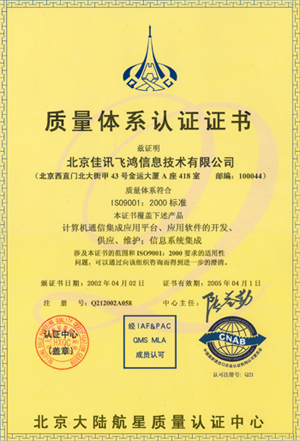 經(jīng)過近半年時間的建立和保持質(zhì)量體系運行,佳訊飛鴻于在2002年3月順利的通過為期三天的嚴格審核,并重點對佳訊公司核心技術(shù)的CTI平臺進行審核。2002年4月2日通過了ISO國際組織的新體系標準ISO9001:2000的體系認證,取得了通過該標準的認證證書。佳訊飛鴻公司也成為國內(nèi)第一家對CTI平臺進行審核并通過認證的公司。其完成標志著公司從成立之時起即嚴格遵循國際企業(yè)標準及現(xiàn)代企業(yè)管理模式,以軟件產(chǎn)品質(zhì)量管理體系為載體,以客戶需求為導向。全面提高產(chǎn)品、服務質(zhì)量,順應不斷變化的技術(shù)發(fā)展方向和市場變化,在質(zhì)量、技術(shù)、成本和交期等方面全力滿足客戶需求,為客戶提供最佳性價比的產(chǎn)品和服務。