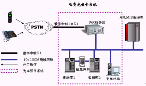 電力繳費(fèi)卡系統(tǒng)系統(tǒng)由自動語音流程服務(wù)器IVR、系統(tǒng)管理終端和數(shù)據(jù)庫三部分組成。如下圖所示: