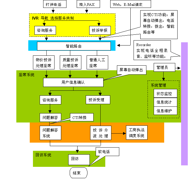 黎明網(wǎng)絡(luò)深入研究世界上最新的CTI技術(shù)的發(fā)展和應(yīng)用,自主研發(fā)推出的12315消費(fèi)者投訴受理系統(tǒng)采用當(dāng)前主流的一體化的呼叫中心模式。一體化的呼叫中心模式具有投資少、易于實(shí)施、維護(hù)工作量較小、維護(hù)成本低的優(yōu)點(diǎn)。該系統(tǒng)建立在內(nèi)部以太網(wǎng)基礎(chǔ)上,不同網(wǎng)絡(luò)(PSTN網(wǎng)、IP網(wǎng)、GSM/GPRS/CDMA網(wǎng))的消費(fèi)者可以通過多種方式(電話、傳真、E-mail、短消息等)接入12315系統(tǒng),利用系統(tǒng)提供的服務(wù)進(jìn)行投訴舉報或咨詢。