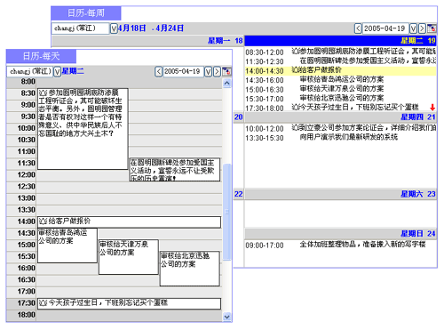 上圖"日歷管理"就借鑒了圖形化交互方法來安排日程和任務。這與您曾經用過的桌面臺歷或記事本一樣,無需介紹就一目了然,并且要比在紙張上勾勾寫寫更方便、更有好處。例如,您此前計劃過日程,實際執(zhí)行有些變化,之后托托拽拽那個日程就可修改開始時間、持續(xù)時間,或修改主題內容,有效提高了記錄工作日程的效率;又例如,可以根據需要設定"提醒"--即便對過期的、未及時處理的工作安排隨后也會提示,有了這樣的人性化服務助手,員工自然歡喜。