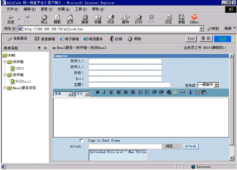 AllyTalk統(tǒng)一消息的電子郵箱具有與Microsoft Exchange或OutLook相同的功能,可以通過設定Email服務的參數,實現(xiàn)公司內部收發(fā)Email,或通過Email服務器實現(xiàn)與Internet的通信;