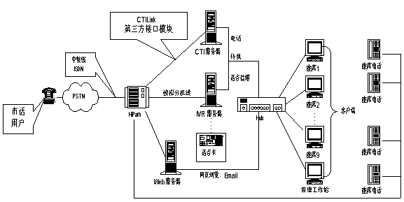 企業(yè)級統(tǒng)一消息平臺,它將交換技術、CTI技術、INTERNET技術合理地應用到系統(tǒng)中,包含了基于數據庫的智能化呼叫分配(ACD)、交互式語音應答(IVR)、傳真服務器(Fax
