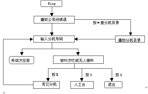 這種情況下自動(dòng)總機(jī)服務(wù)扮演了如同人工總機(jī)的角色,提示來話方鍵入分機(jī)號(hào)碼并將其轉(zhuǎn)接到指定的分機(jī)去。如果轉(zhuǎn)接不成功(被叫方占線,無人接聽等)系統(tǒng)提示主叫轉(zhuǎn)到其它分機(jī)或轉(zhuǎn)人工臺(tái)。
