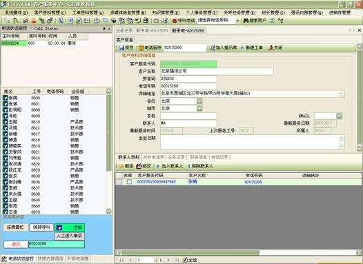 系統(tǒng)與CTI服務(wù)器配合,輕松實(shí)現(xiàn)諸如:最佳路由選擇、自動(dòng)彈出客戶信息、座席通過屏幕控制電話接聽,轉(zhuǎn)接,會(huì)議,監(jiān)聽等。同時(shí),系統(tǒng)支持由座席安排定時(shí)電話自動(dòng)外撥、批量電話外撥、批量傳真發(fā)送、坐席通話錄音、坐席通話監(jiān)聽等服務(wù)。