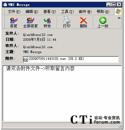 A、電子郵件檢索:語音留言可以以Email方式,發(fā)送到信箱主人的郵箱中,用戶可以使用Outlook、Foxmail或其它郵件方式,以附件方式收取個人的語音留言,通過PC上的揚聲器、耳機(jī)來收聽消息。