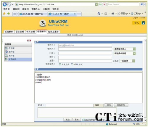 電子郵箱具有與Notes或OutLook相同的功能,可以通過設(shè)定Email服務(wù)的參數(shù),實現(xiàn)公司內(nèi)部收發(fā)Email,或通過Email服務(wù)器實現(xiàn)與Internet的通信。