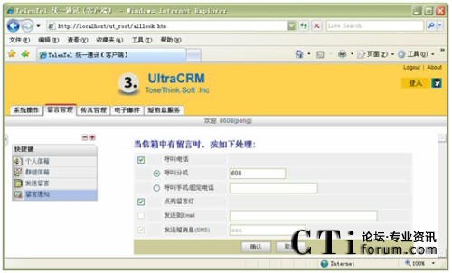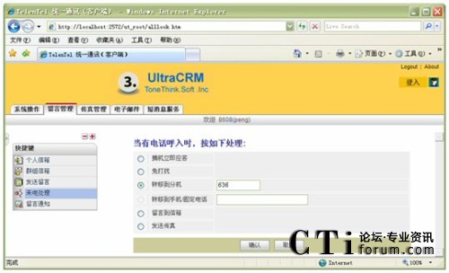 信箱主人通過Web方式的客戶端,根據(jù)實際需要,將來話設(shè)置為轉(zhuǎn)接到不同的目標(biāo),如:語音信箱留言、內(nèi)部其它分機(jī)、轉(zhuǎn)移至手機(jī)、轉(zhuǎn)移至外線;