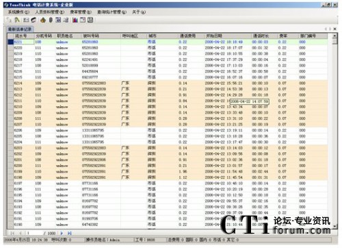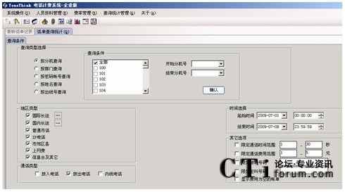 系統(tǒng)提供多種查詢條件,進(jìn)行話單明細(xì)和話單結(jié)算的統(tǒng)計,如:按分機(jī)、部門、密碼、職員名稱、出現(xiàn)號碼、通話時間范圍、通話費用范圍、制定主叫、制定被叫、不同的通話類型(國內(nèi)長途、國際長途、市話、IP等)。