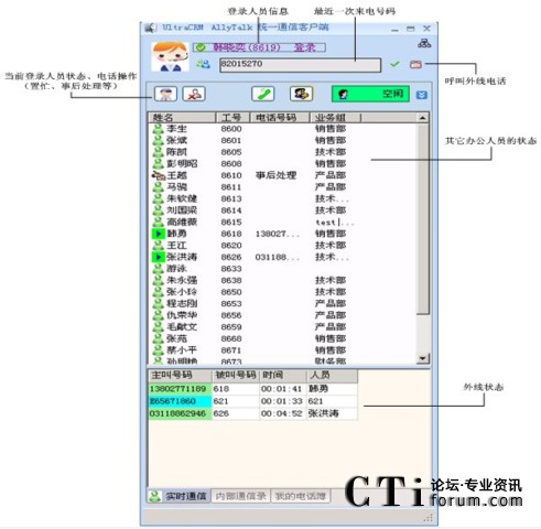 辦公人員可以通過(guò)時(shí)實(shí)電話(huà)的界面:實(shí)時(shí)監(jiān)控系統(tǒng)的呼叫隊(duì)列、其它辦公人員的工作狀態(tài);并且通過(guò)屏幕控制電話(huà)的接答、掛機(jī)、轉(zhuǎn)接,以及建立會(huì)議等操作。如下圖所示: