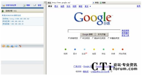 在客服人員與網(wǎng)站訪(fǎng)客聊天的過(guò)程中,可以通過(guò)“網(wǎng)頁(yè)同步”,使網(wǎng)站訪(fǎng)客的電腦上自動(dòng)彈出與客服人員同樣的網(wǎng)頁(yè)(如下圖:網(wǎng)站訪(fǎng)客的電腦上自動(dòng)彈出www.google.com的網(wǎng)站)。