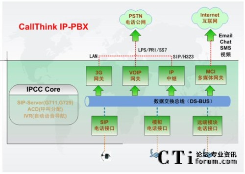 IPCC Core是IP-PBX的核心部分,提供了配置IP分機(jī)號(hào)碼(Extension Number)、功能按鈕以及通話(huà)管理和ACD路由策略功能;它可以支持多達(dá)1000個(gè)IP語(yǔ)音終端呼叫請(qǐng)求,通過(guò)分組交換,實(shí)現(xiàn)IP分機(jī)、普通分機(jī)、互聯(lián)網(wǎng)上IP電話(huà)之間的互聯(lián)互通;通過(guò)Voip網(wǎng)關(guān),可以實(shí)現(xiàn)IP網(wǎng)絡(luò)和傳統(tǒng)電路交換電話(huà)網(wǎng)的通信,完成異種網(wǎng)絡(luò)的電話(huà)呼入和呼出;