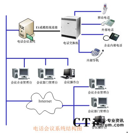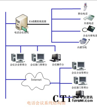 TalenTel CNF電話會議系統(tǒng)可以與程控交換機配合使用,也可以直接與局方的系統(tǒng)進行連接,系統(tǒng)的構成含如下幾部分:TalenTel CNF電話會議系統(tǒng)服務器(ctsIVR)、會議企業(yè)管理員模塊、會議部門管理員模塊、會議操作員管理模塊、數(shù)據(jù)庫等組成。