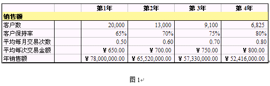 第1年,平均每個(gè)客戶每個(gè)月交易的次數(shù)是0.50次,平均每次的交易金額是¥650.00,因此第1年的銷售額是¥650.00*(0.5次/月*12個(gè)月)*20,000