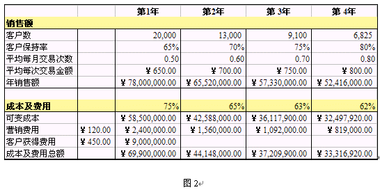 = ¥78,000,000.00。隨著時(shí)間的推移,保留下來(lái)的老客戶平均每個(gè)月的交易次數(shù)逐步從0.50次上升到0.80次,而且每次采購(gòu)的金額也逐步從¥650.00提高到¥800.00;但是由于這一組客戶的數(shù)量不斷減少,年銷售額逐步從¥78,000,000.00下降到了¥52,416,000.00。
