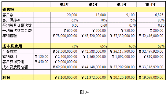 如圖3所示,將各年的銷售額分別減去成本及費(fèi)用,就得到各年度的利潤(rùn)額。我們發(fā)現(xiàn)這一組客戶貢獻(xiàn)的利潤(rùn),從第1年的¥8,100,000.00到第2年的¥21,372,000.00,有顯著上升;利潤(rùn)在第2年達(dá)到頂點(diǎn)后,逐年緩慢下降,下降的幅度比較小。