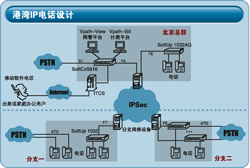 港灣網絡的IP電話系統(tǒng)是一個基于MGCP協議的IP電話系統(tǒng),由總部放置Softco5816語音交換機(主要功能是媒體網關控制器和部分媒體網關功能),用于接入用戶電話終端的Softup系列接入網關和軟電話系統(tǒng)(針對移動用戶和遠程辦公用戶)構成。提供了計費、管理軟件,以及基于軟件方式的話務臺。
