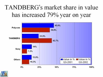 產(chǎn)地挪威,該品牌為視頻會(huì)議業(yè)界的高端產(chǎn)品。該品牌全系列均屬第三代產(chǎn)品,具有多項(xiàng)視頻會(huì)議的首創(chuàng)技術(shù),最高功耗只有65W,最高帶寬3M,是美國(guó)國(guó)防部、加拿大國(guó)防部、聯(lián)合國(guó)教科文組織、歐洲多個(gè)國(guó)家王室及大型跨國(guó)集團(tuán)選用的品牌。現(xiàn)在全球市場(chǎng)占有量第一位(依據(jù)2002年第3季度資料)。
