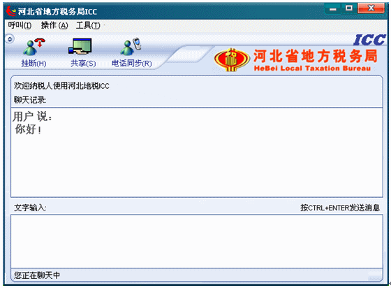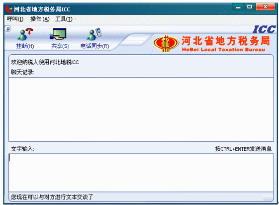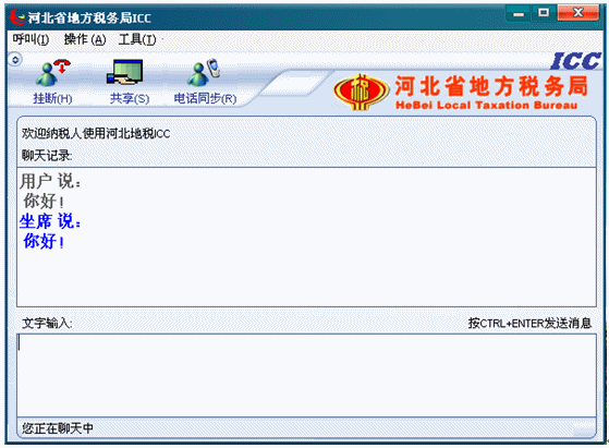 7.等待座席應(yīng)答后,左下角的狀態(tài)欄文字提示首先變?yōu)椤澳F(xiàn)在可以與對方進(jìn)行文本交談了”,從現(xiàn)在開始到納稅人掛斷呼叫期間,納稅人就可以和座席進(jìn)行文本交談了。