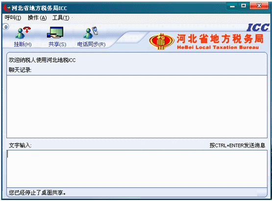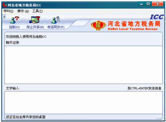 9.遠(yuǎn)程共享:點(diǎn)擊ICC界面中的共享按鈕,納稅人電腦的桌面背景將被置成一種單一的顏色并且共享按鈕變成停止共享按鈕,座席在遠(yuǎn)端就可以看到納稅人的桌面,并能操作納稅人的桌面,此時(shí)左下角狀態(tài)欄提示“您正在給座席共享您的桌面”。如下圖: