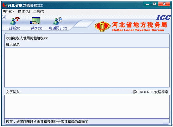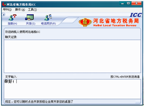 緊接著狀態(tài)文字提示變?yōu)椤艾F(xiàn)在,你可以隨時(shí)點(diǎn)擊共享按鈕讓座席共享你的桌面了”,此時(shí),納稅人如果需要座席共享(看到和操作)納稅人的桌面,就可以點(diǎn)擊共享按鈕,讓座席共享納稅人的桌面了。如下圖: