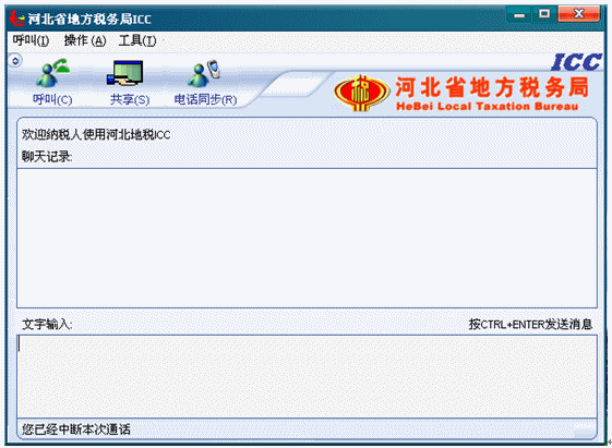 10.掛斷:如果納稅人想中止和此座席的通信(文本交談和遠(yuǎn)程共享),納稅人可以點(diǎn)擊掛斷按鈕。掛斷后左下角狀態(tài)欄提示“您已經(jīng)中斷本次通話”。如下圖: