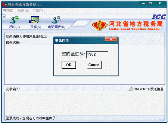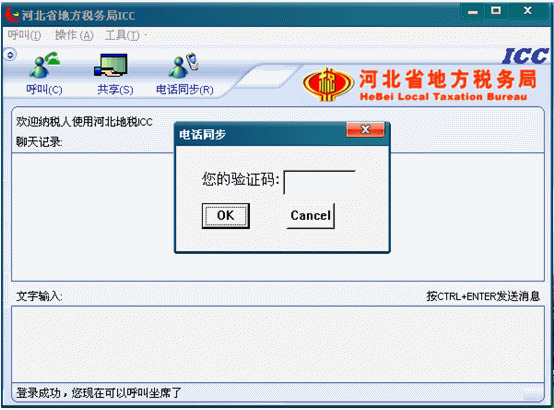 11.電話同步(一種直接呼叫指定座席的功能):如果納稅人先撥打12366,正在和河北省地市的某一座席通電話。此時(shí),納稅人需要此座席向納稅人提供ICC的幫助(文本交談和遠(yuǎn)程共享),納稅人就不能直接點(diǎn)擊呼叫按鈕,因?yàn)榧{稅人點(diǎn)擊呼叫按鈕系統(tǒng)將把納稅人的呼叫轉(zhuǎn)向納稅人呼叫地市的任意空閑座席,可能納稅人的呼叫就不能被轉(zhuǎn)到此時(shí)和納稅人通話的座席。準(zhǔn)備電話功能就能幫助納稅人直接呼叫到和納稅人通電話的座席。具體做法如下:通過電話,向和納稅人通電話的座席要一個(gè)驗(yàn)證碼,讓后點(diǎn)擊準(zhǔn)備電話按鈕,此時(shí)將出現(xiàn)一個(gè)“電話同步”的對話框,如下圖:
