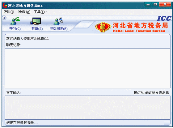 4.選擇城市,點(diǎn)擊確定后,出現(xiàn)ICC界面,此時(shí)ICC處于登錄服務(wù)器狀態(tài),左下角的狀態(tài)欄有文字提示“您正在登錄服務(wù)器……”。如下圖:
