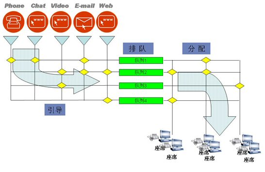 對于多種媒體采用統(tǒng)一的ACD處理方式,經過引導,進入不同的隊列,分配到不同的坐席組。