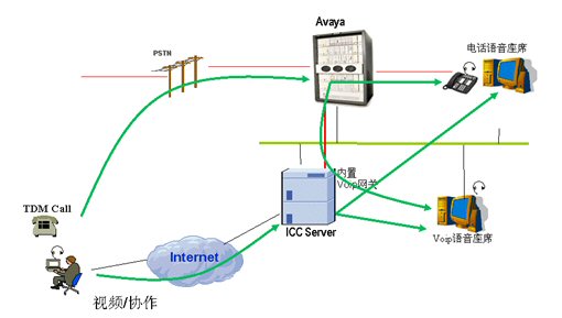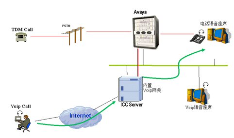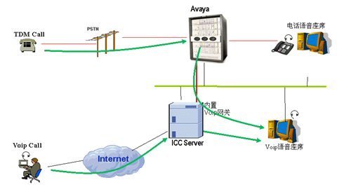 通過Internet來的Voip呼叫通過ICC服務器的內置Voip網關轉換為電路形式的電話,呼叫交換機,分配到座席。