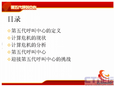 我把第五代呼叫中心的概念詳細地論述一下。主要是分成五個部分,第一個是第五代呼叫中心的定義;第二個計算危機的現(xiàn)狀;第三是計算危機的分析;第四第五代呼叫中心;第五是結論——迎接第五代呼叫中心的挑戰(zhàn)。