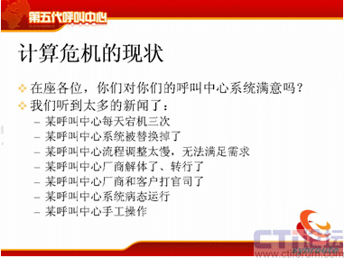 呼叫中心現(xiàn)在已經(jīng)了比較嚴重的計算危機,我聽到了很多,因為我重點是在搞技術這一行當,我就問一個問題,在座的各位,你們對你們的呼叫系統(tǒng)滿意嗎?我相信大部分人可能嘴上都說比較滿意,但是很多人對深層次的矛盾都非常清楚,為什么不滿意?