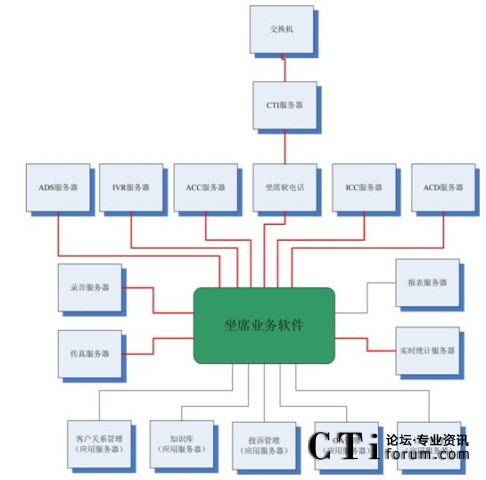很多集成商或業(yè)務(wù)軟件開發(fā)商認(rèn)為這種結(jié)構(gòu)過于復(fù)雜,而他們自身往往提供“整體解決方案”,即所有的服務(wù)器軟件基本上都是自己的,根據(jù)客戶的要求修改即可。例如,客戶關(guān)系管理、知識庫、投訴管理、OA、訂單管理以及坐席軟電話、ADS服務(wù)器、IVR服務(wù)器、ACC服務(wù)器、ICC服務(wù)器、ACD服務(wù)器、錄音服務(wù)器、傳真服務(wù)器、報(bào)表服務(wù)器、實(shí)時統(tǒng)計(jì)服務(wù)器都是自己來做,那么對于很多接口環(huán)節(jié)都可以節(jié)省了。