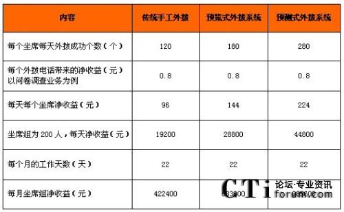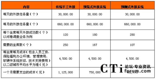 從上表可以看出,在同等每天3萬個呼叫任務(wù)的情況下,由于使用預(yù)測式外撥系統(tǒng)使得效率提升,所需人員數(shù)比預(yù)覽式外撥方式少用60人,比傳統(tǒng)手工外撥人員數(shù)量減少一半多,省的費用也相當(dāng)可觀。