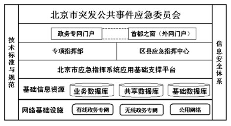 根據(jù)北京市《應急指揮系統(tǒng)信息化技術(shù)支撐體系》,北京市的應急系統(tǒng)能夠體系結(jié)構(gòu)細化為下圖: