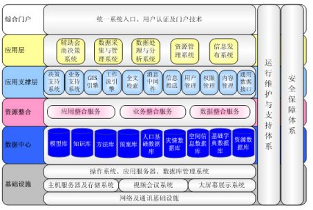 中科軟依據(jù)據(jù)北京市的總體框架,結(jié)合中科軟多年應急系統(tǒng)的經(jīng)驗,進一步細化應用框架到可實施框架,從下向上依次是基礎(chǔ)設(shè)施層、數(shù)據(jù)中心層、資源整合層、應用支撐層、應用層、綜合門戶,并有安全保障體系和運行維護與支持體系保障系統(tǒng)的正常運行。如下圖所示: