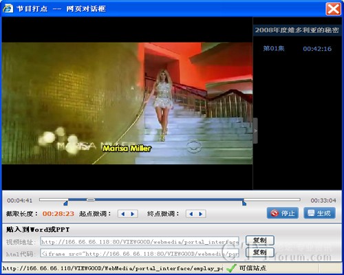 拖動進(jìn)度條左右的打點按鈕可以設(shè)定片段的開始和結(jié)束時間點,還可以點擊起點微調(diào)和重點微調(diào)的左右箭頭對截取的視頻進(jìn)行微調(diào),然后點擊“生成”,再點擊“復(fù)制”可以將截取的節(jié)目URL粘貼到WORD、PPT、BBS或BLOG等頁面中。