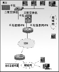 視頻VPN的千兆出口、信息網(wǎng)VPN的千兆出口以及MCU的千兆口(通過(guò)MCU側(cè)的二層交換機(jī))分別連接到省公司的骨干三層交換機(jī)上。通過(guò)三層交換機(jī)的路由設(shè)置,MCU既可以與視頻VPN互相訪問(wèn),也可以與信息網(wǎng)互相訪問(wèn),但視頻VPN和信息網(wǎng)不能互相訪問(wèn)。