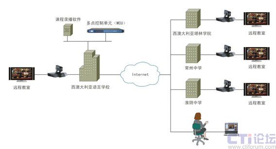 中澳遠(yuǎn)程教育系統(tǒng)采用科達(dá)KDV8000C多點(diǎn)控制單元(MCU)1臺(tái)和課程錄播軟件1套安裝在西澳大利亞語(yǔ)言學(xué)院,4臺(tái)TS6610視頻會(huì)議終端,分別安裝在西澳語(yǔ)言學(xué)院、堪林學(xué)院、常州中學(xué)和淮陰中學(xué)的遠(yuǎn)程教室。此外,考慮到遠(yuǎn)程授課的實(shí)際應(yīng)用需求,系統(tǒng)還提供了無(wú)線麥克接入方案。系統(tǒng)部署拓?fù)鋱D見(jiàn)下圖。