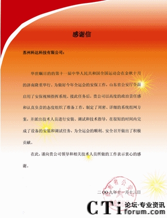 CTI論壇(ctiforum)12月29日消息(記者 張塵):日前 ,山東省公安廳向蘇州科達(dá)科技有限公司發(fā)來感謝信,對蘇州科達(dá)為保障全運會順利、安全召開所做的貢獻(xiàn)表示衷心的感謝。