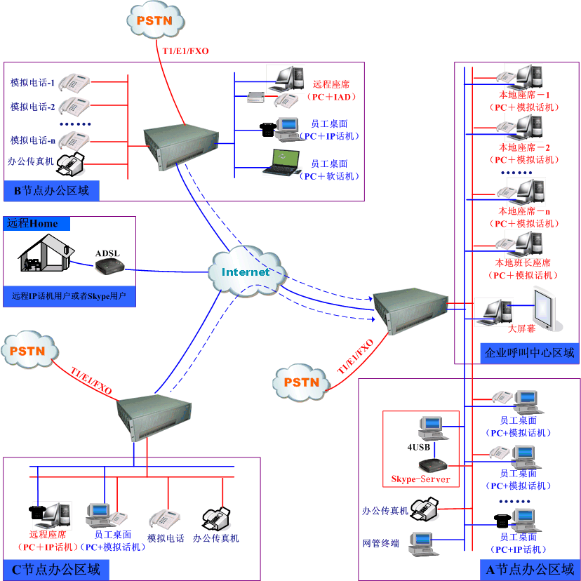 各區(qū)域內(nèi)部員工可以進(jìn)行0話費(fèi)的通話和傳真外,還可以非常輕松的實(shí)現(xiàn)長(zhǎng)途旁路功能 (即長(zhǎng)途費(fèi)用變市話費(fèi)用功能);同時(shí)每部分機(jī)同時(shí)具有一個(gè)真實(shí)的當(dāng)?shù)厥性捥?hào)碼和一個(gè)內(nèi)部分機(jī)號(hào)。
